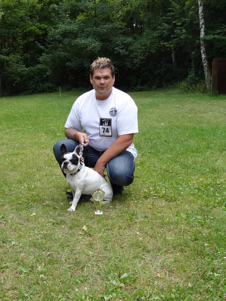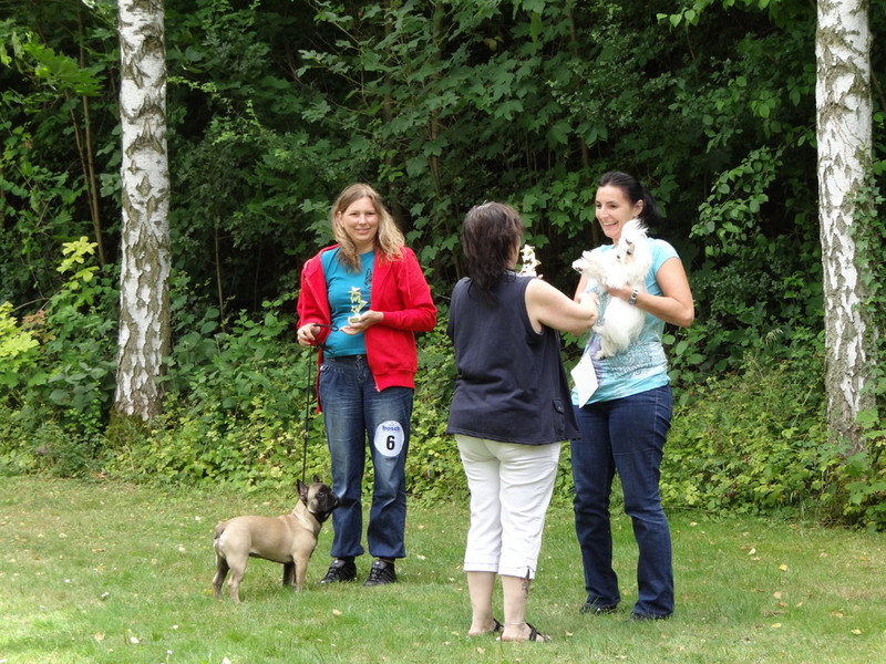 Es gibt aber auch erfreuliche Dinge. Wir waren am 29.07.12 auf einer Ausstellung und ich wurde zur schönsten französichen Bulldogge gewählt. Frauchen und Herrchen haben sich wie verrückt gefreut und mich ganz arg gedrückt und geknuddelt, bis mir fast die Luft weg blieb. Man war das peinlich vor den anderen Rüden. Da hab ich mir den ganzen Tag so ne Mühe gemacht und hab jeden mal angebellt und angerempelt und dann das....